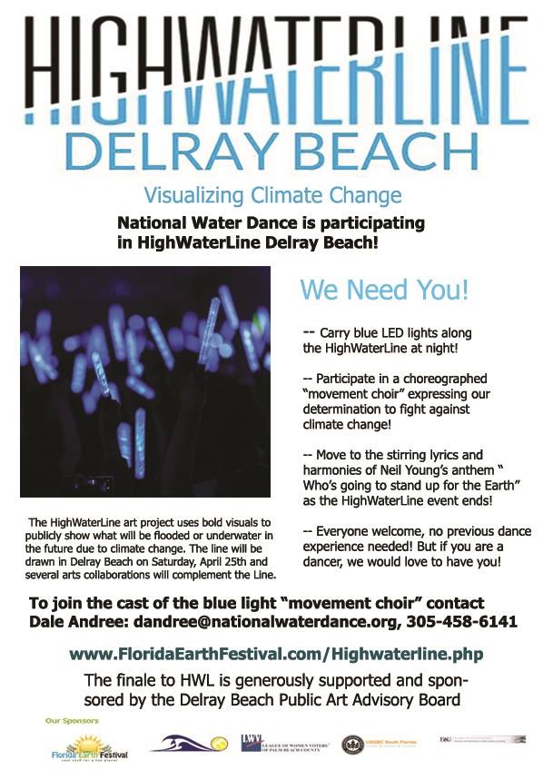 Blue LightsAs residents of one of the states most vulnerable to sea level rise, Floridians are fortunate that Eve Mosher will be making a return engagement, this time in Palm Beach County later this month, chalking sea level rise for the HighWaterLine Delray Beach event. This day-long performance is part of the 2nd Annual Florida Earth Festival, a series of workshops and demonstrations that runs April 18 through 25, including a weekend of intensives at the Unitarian Universalist Fellowship of Boca Raton, 2501 St. Andrews Blvd.  Volunteers are needed for all kinds of tasks during the festival, and if you are able, I urge you to find what speaks to you and sign up.  For this yoga instructor and lover of dance, it is the prospect of being in the grand finale of the HWL mapping: a ‘movement choir’ of dancers holding blue glow lights and moving to Neil Young’s new anthem: Who Is Going to Stand Up for the Earth.