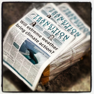 Here’s my gift to you: a sample edition of Transition Free Press. http://issuu.com/transitionfreepress/docs/tfp_1final_online to page through on your screen (for now). If you’ve wondered how people all over the world are responding to crisis…You can in the space of a few minutes flick through 24 pages and see what Transition means as a culture, a whole new way of living on the planet. It’s a multi-voiced operation. It’s a We thing. During the pilot over 100 contributors wrote stories, telling us about their projects, writing them from the field, from experience. Here I am! Here we are!